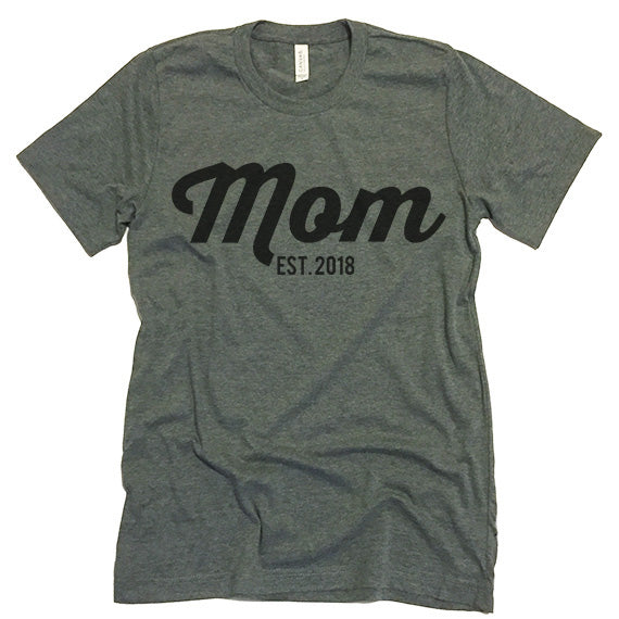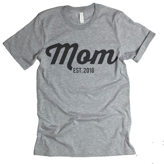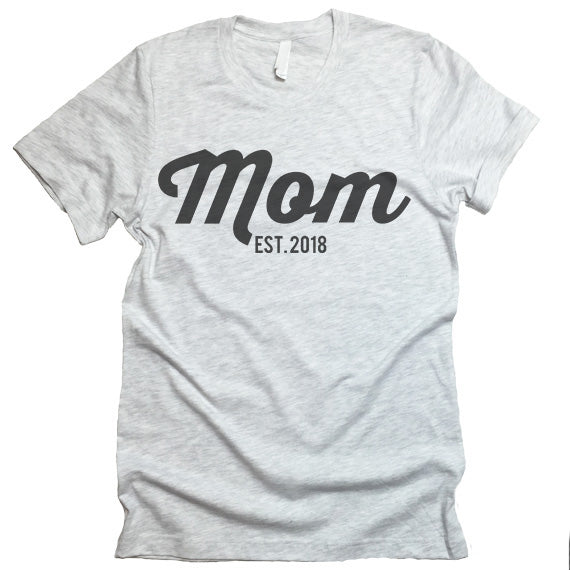 The listing is for one short-sleeve unisex crew-neck t-shirt with “Mom Est 2018” print.